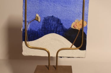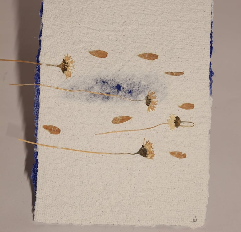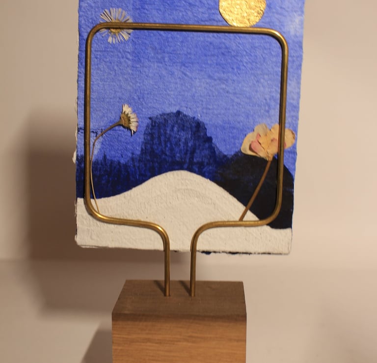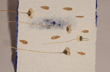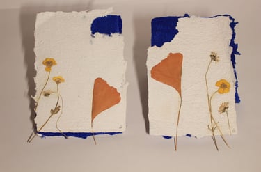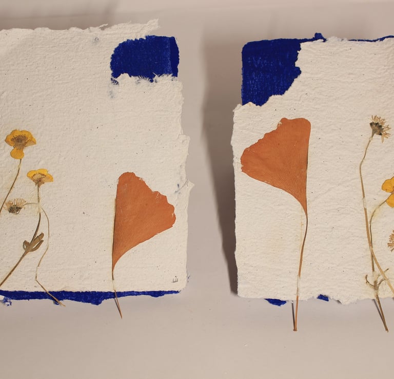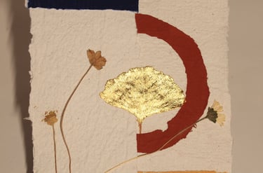 Tableaux de pigments minéraux, fleurs séchées et feuilles d'or.